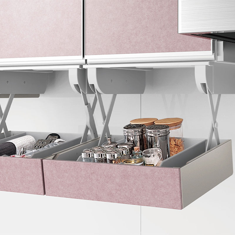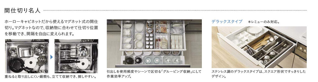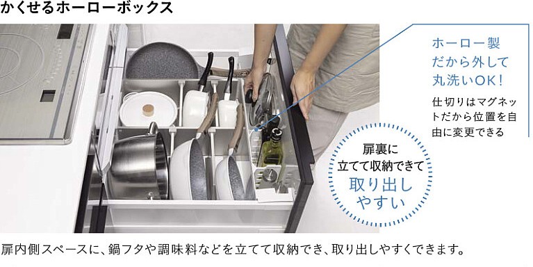 引出しを降ろしたままでも、調理の邪魔になりません。目の高さまで引き降ろせるので、引出しの中全体が見えます。だから、どこに何があるかスグに分かります。